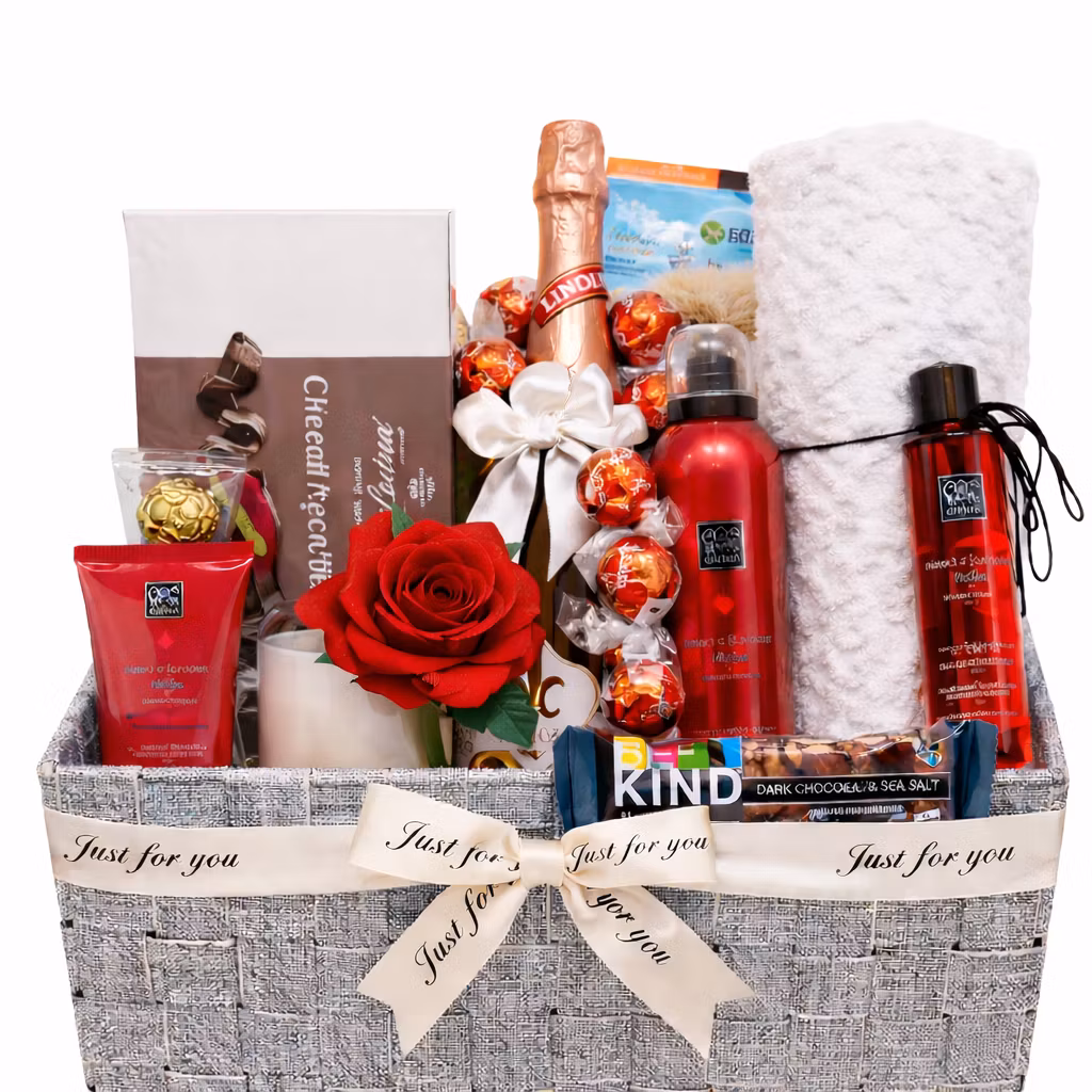 An elegant spa basket filled with Rituals products, cozy touches, sweet chocolates, and sparkling non-alcoholic cider/wine — the perfect indulgent gift for her.